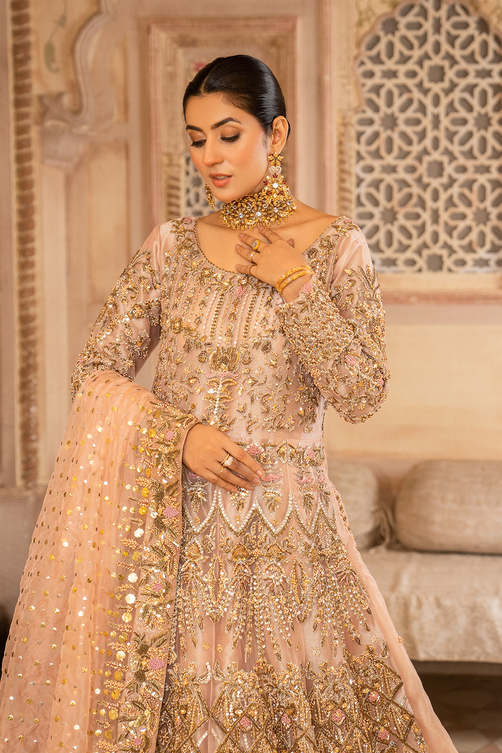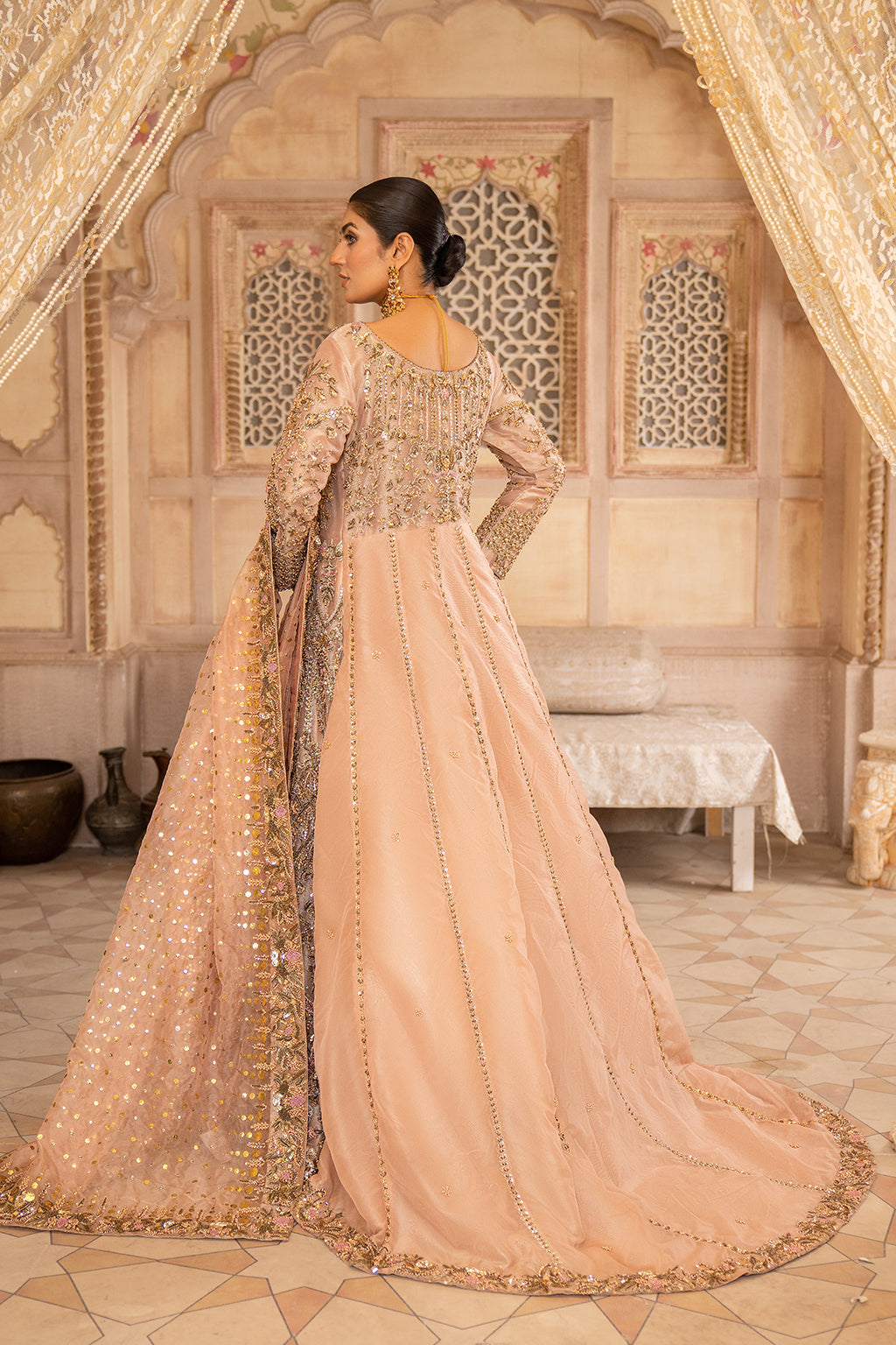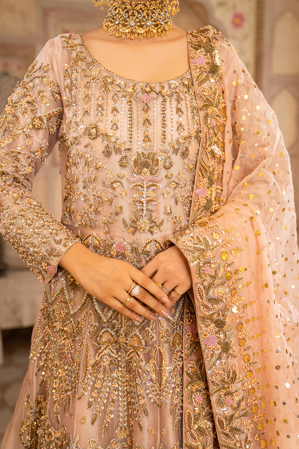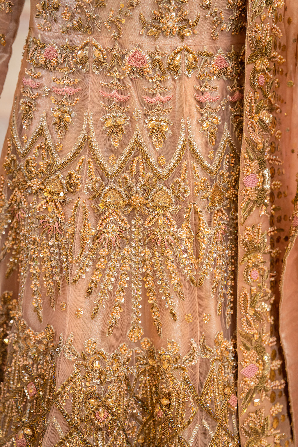 A graceful pink long maxi featuring intricate heavy work on the front and extending elegantly to the lower back.