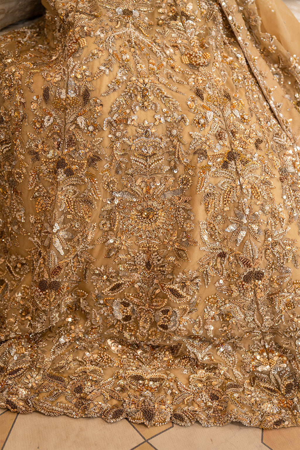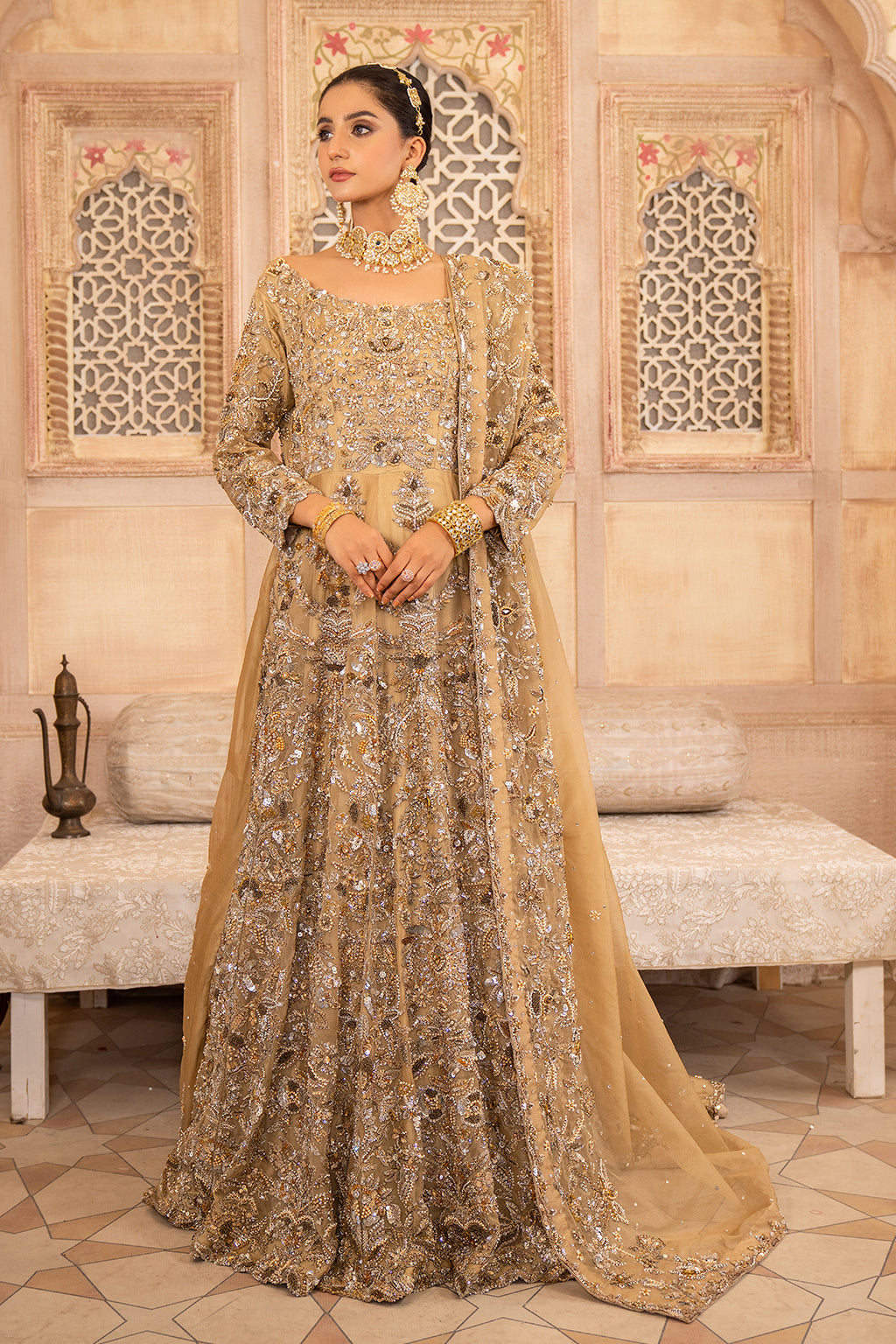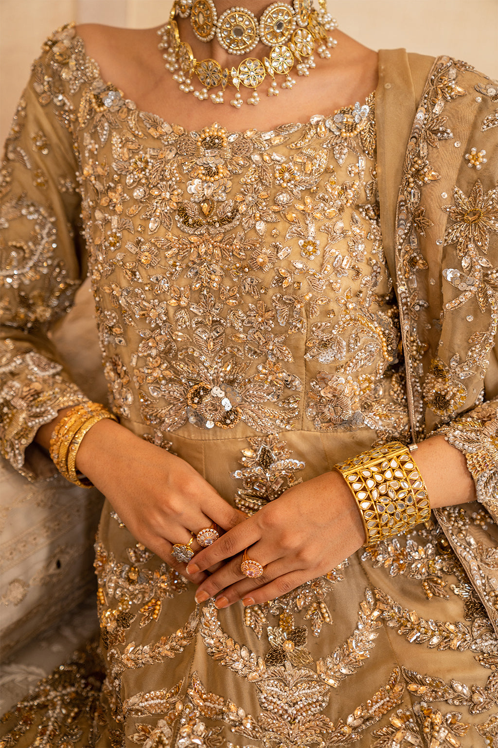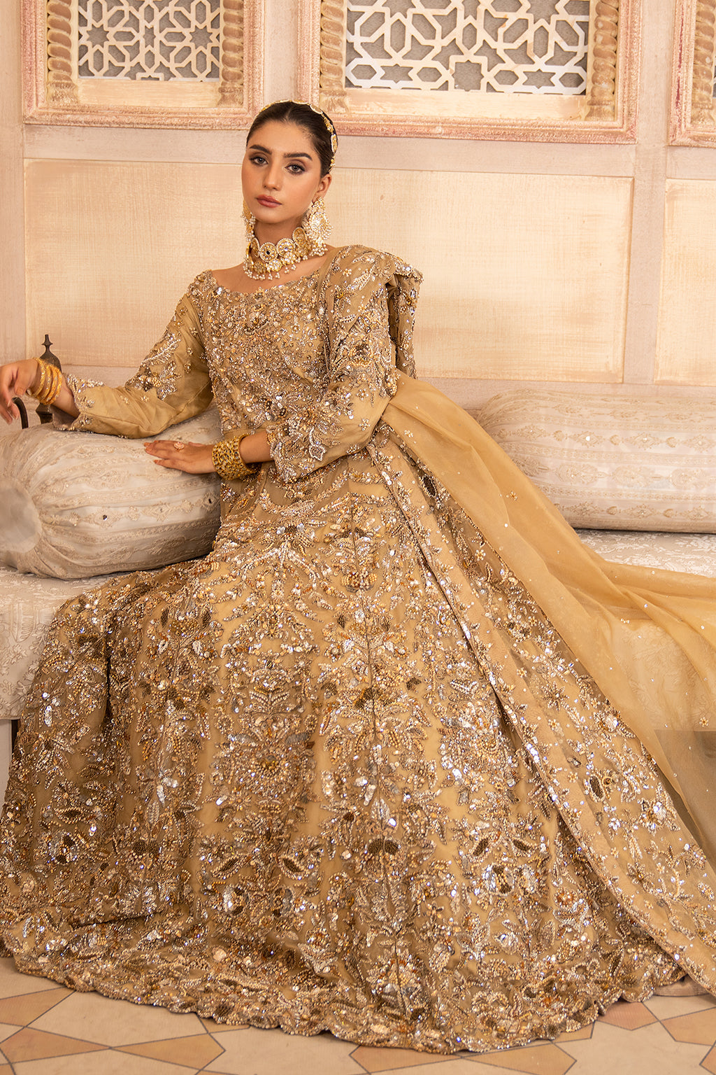 Fully embellished front and back using a lavish mix of dabka, kora, pearls, stones, sequins, resham thread work, adding rich texture and luxurious shine