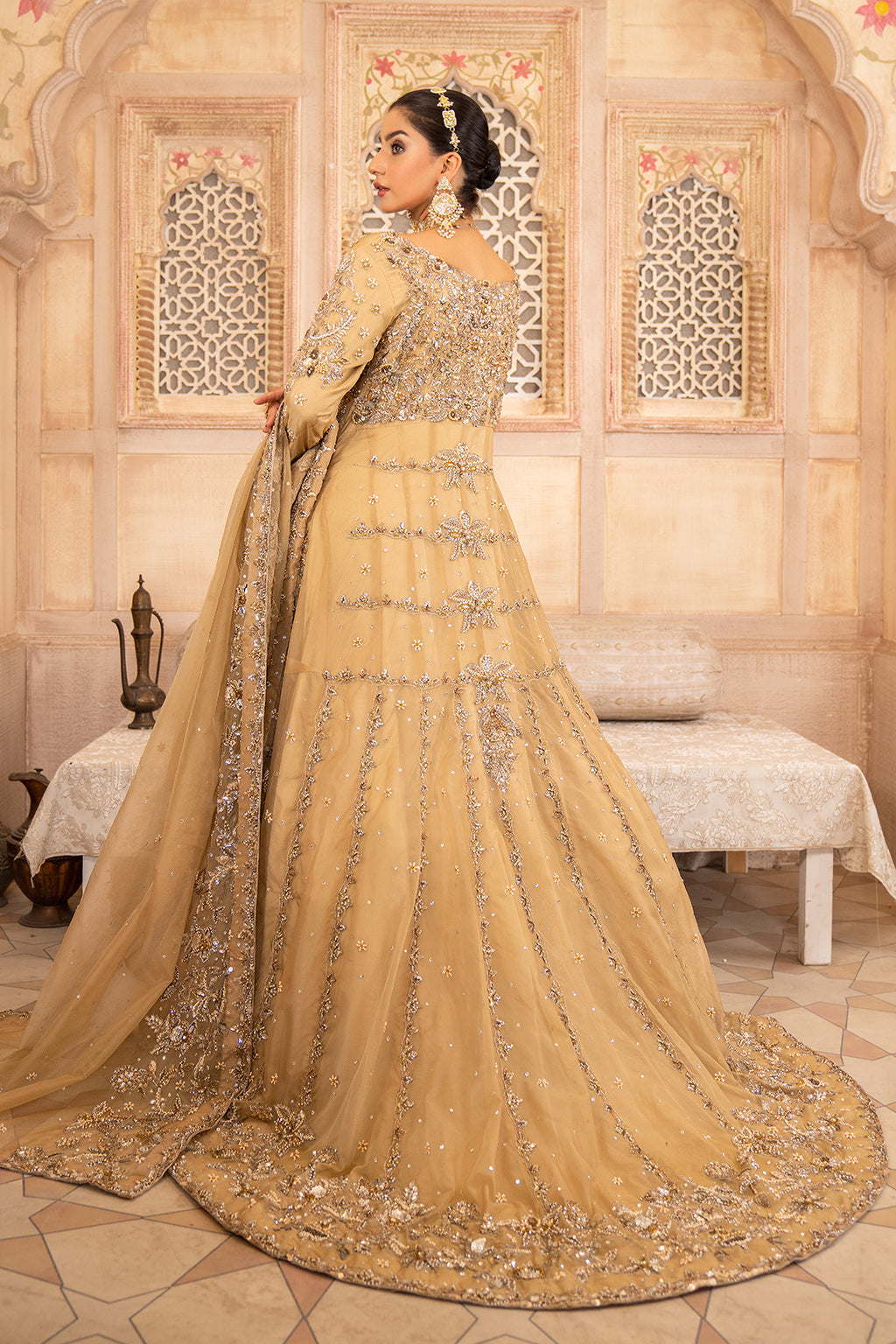 Made in pure golden organza, full-length with a dramatic trail at the back—perfect for a grand entrance.