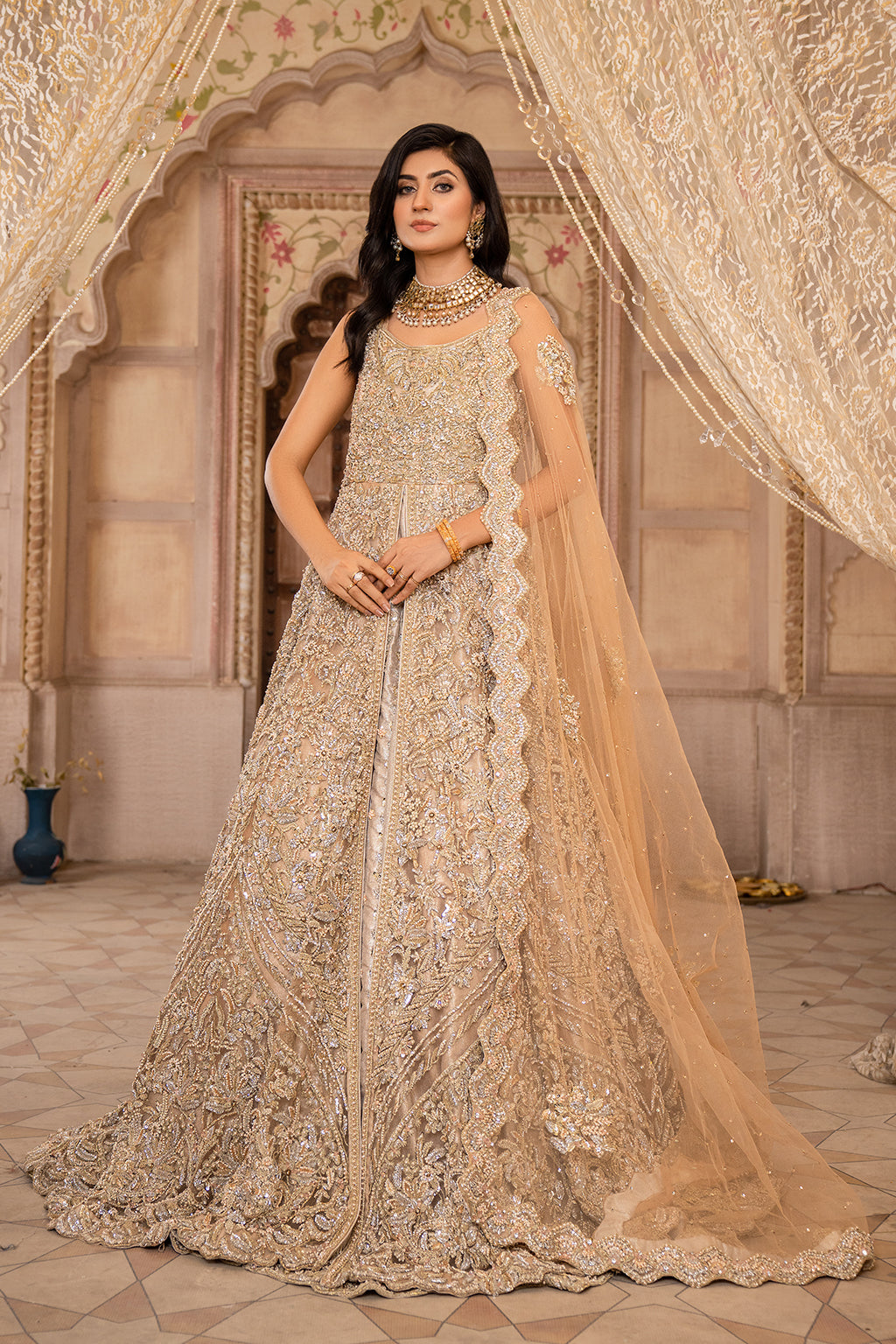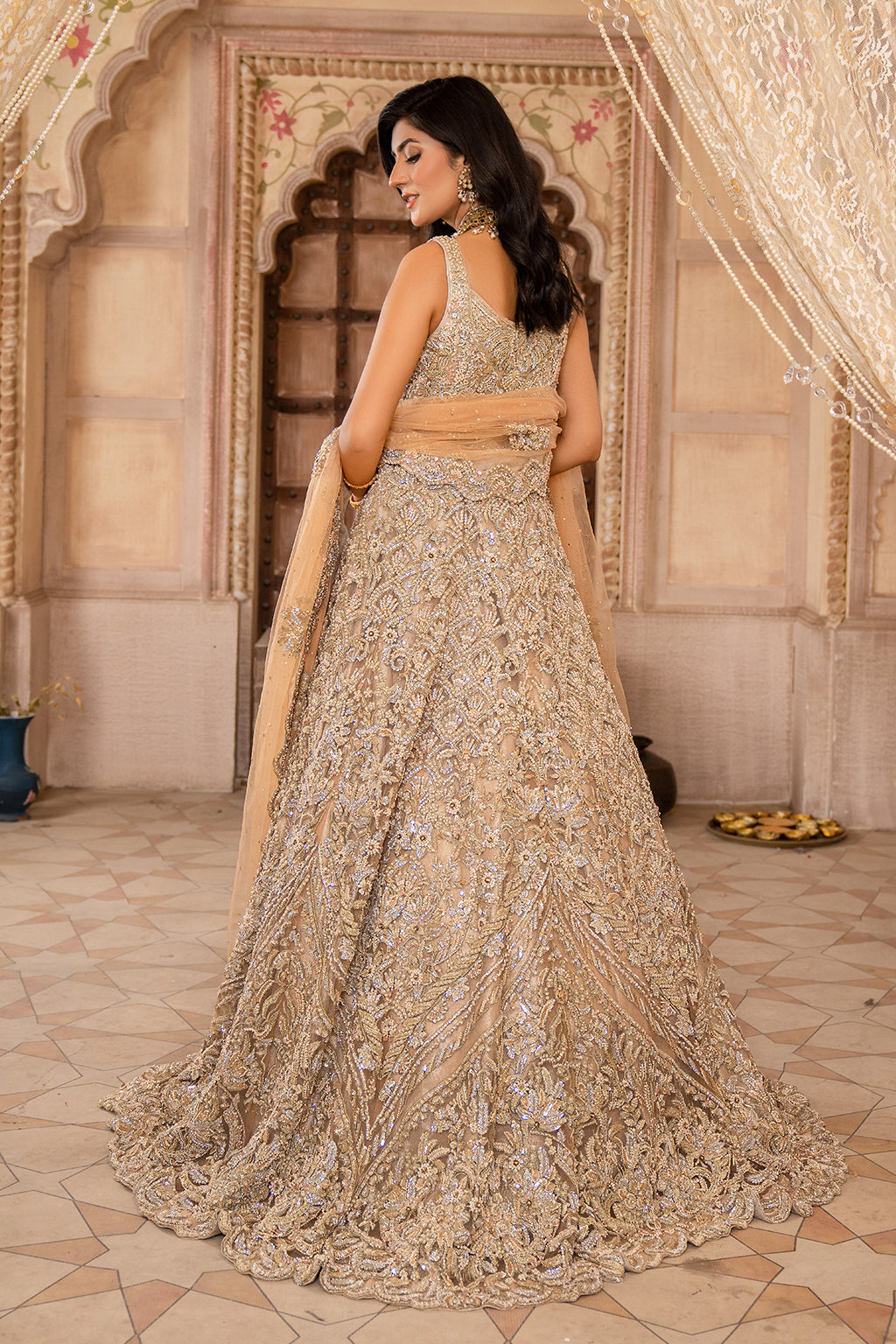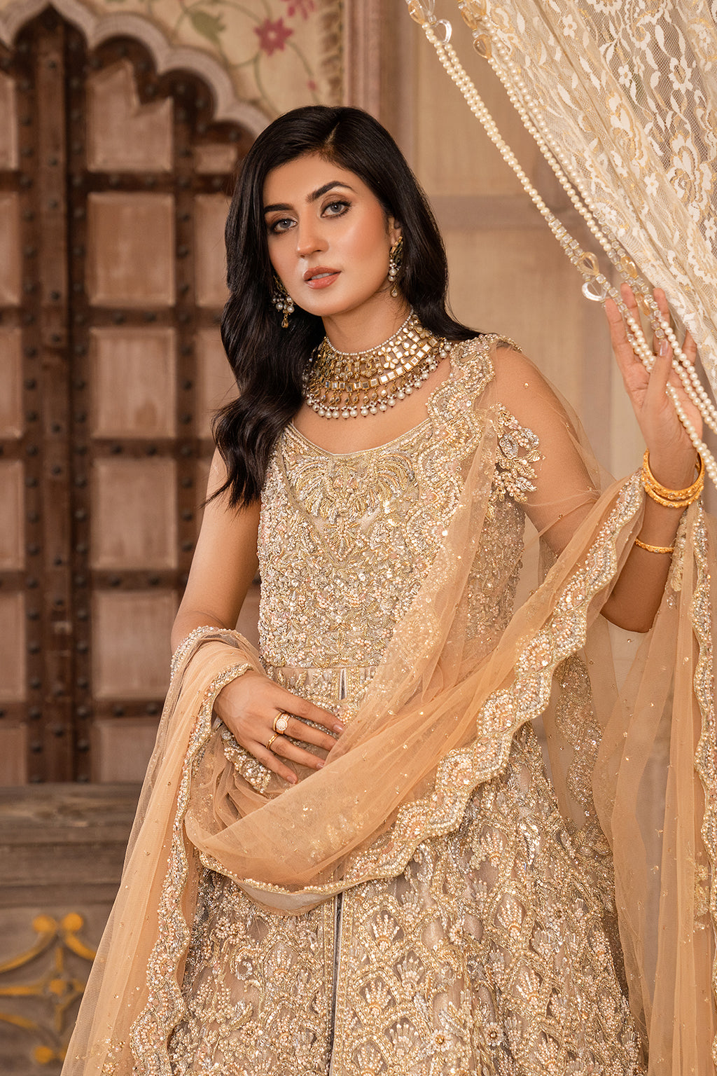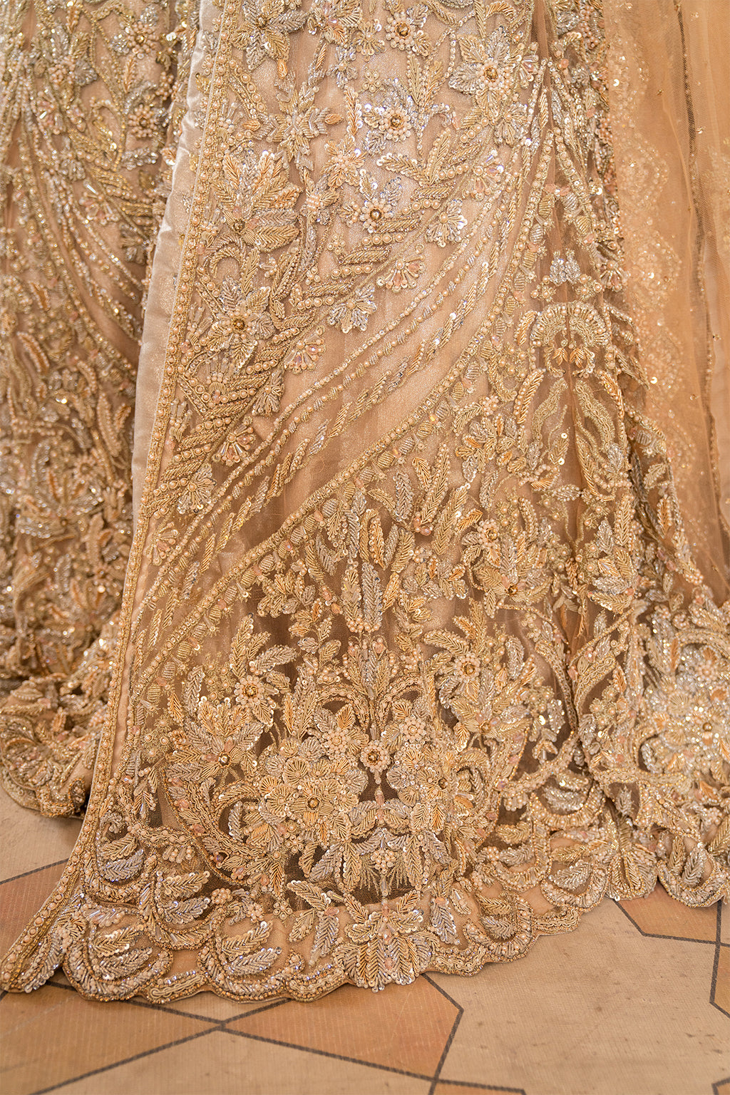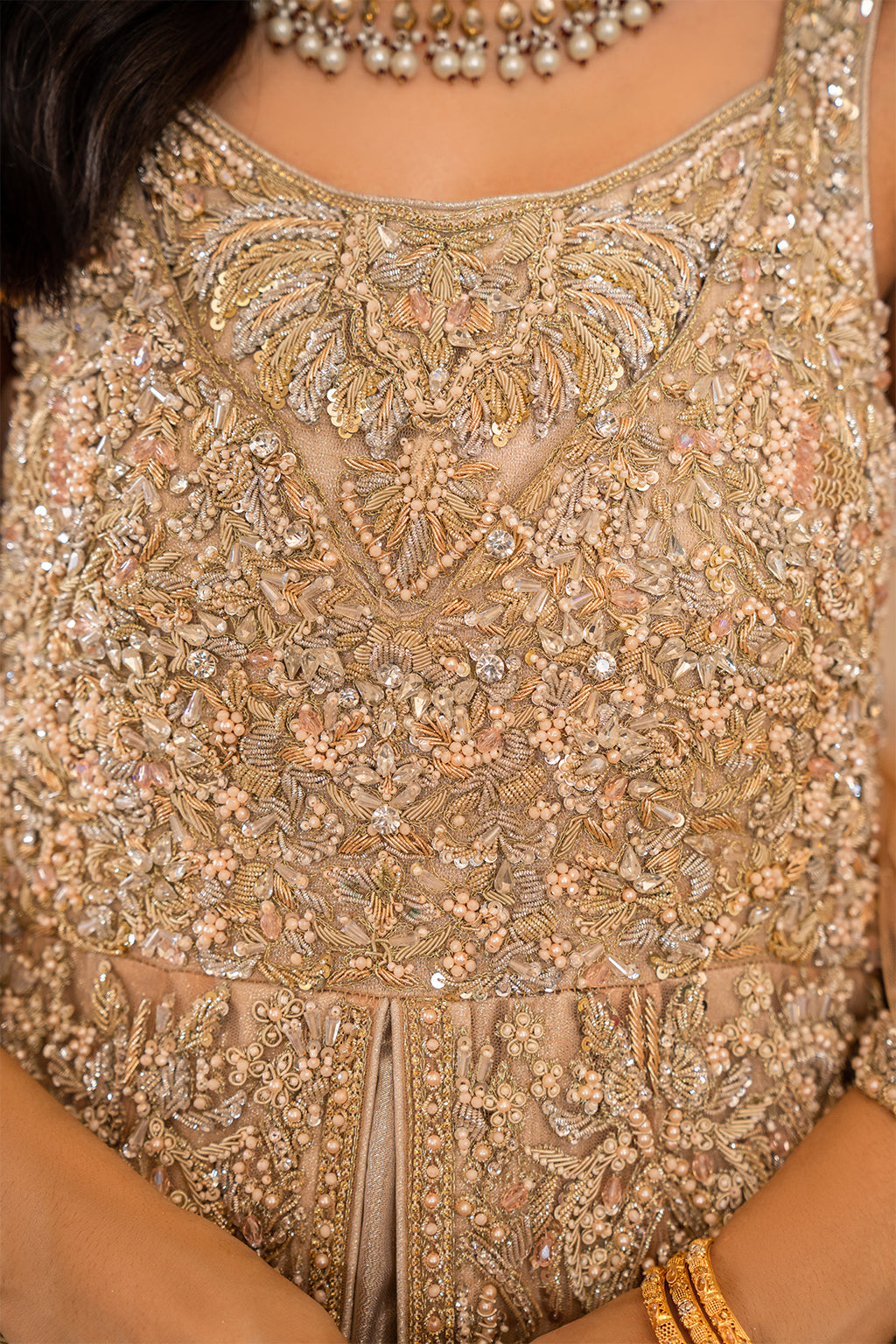 Maxi Dress: Stunning golden maxi gown featuring full heavy embroidery on both the front and back, creating a luxurious and radiant look. The intricate work adds depth and richness to the ensemble, perfect for grand occasions.