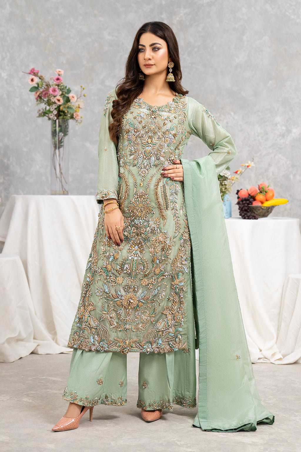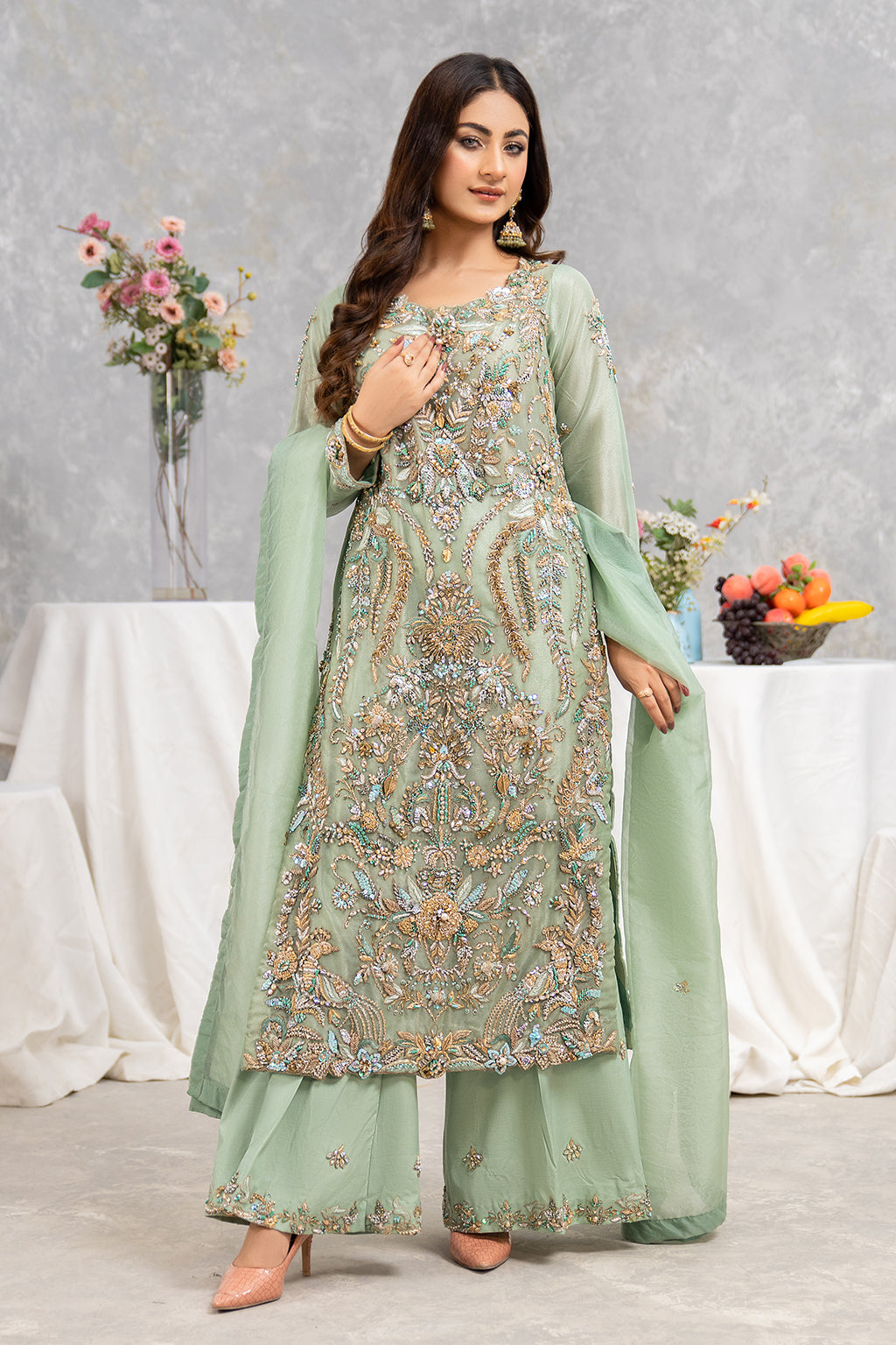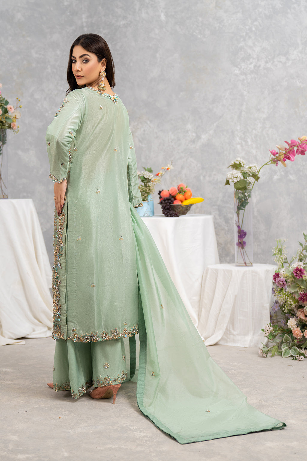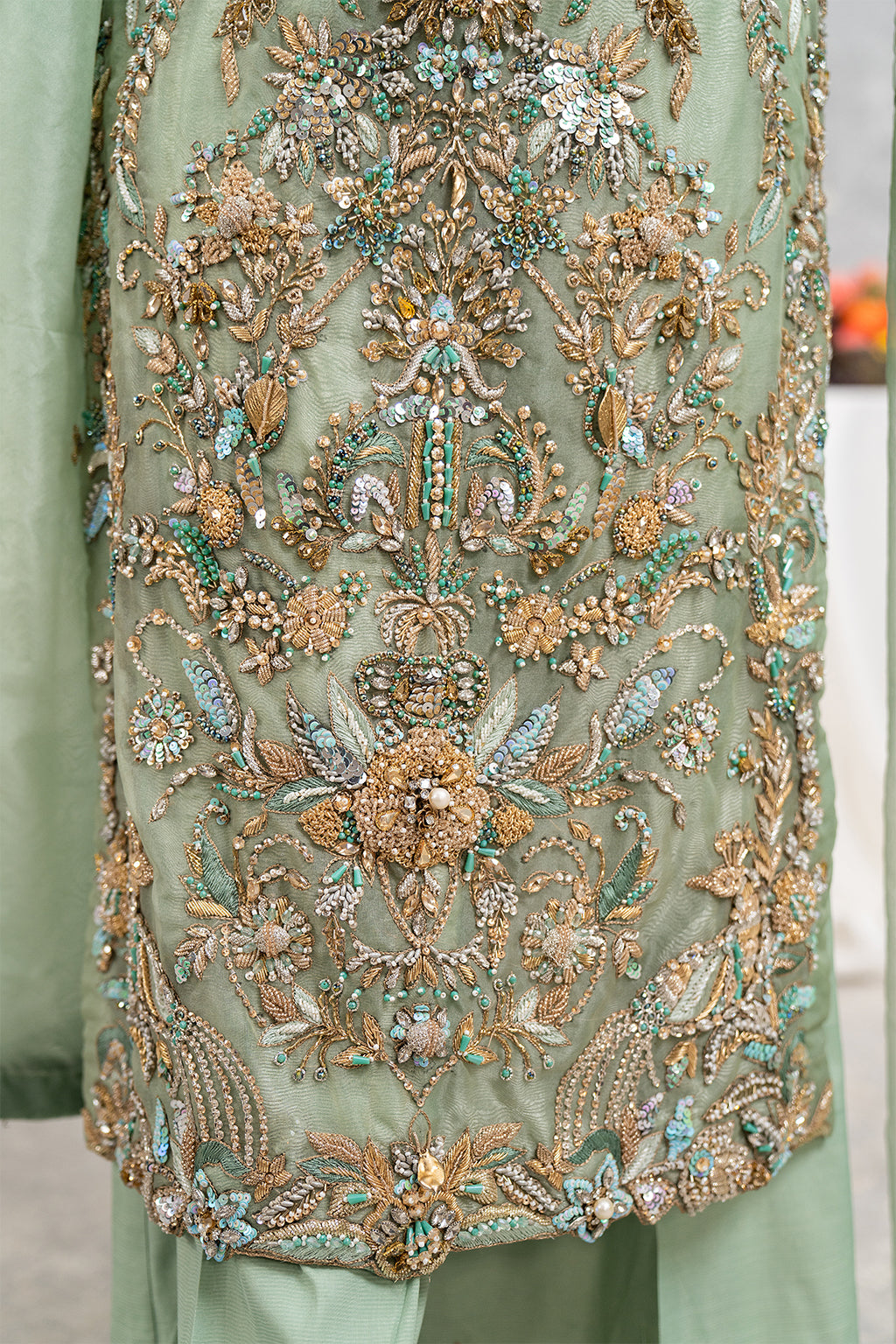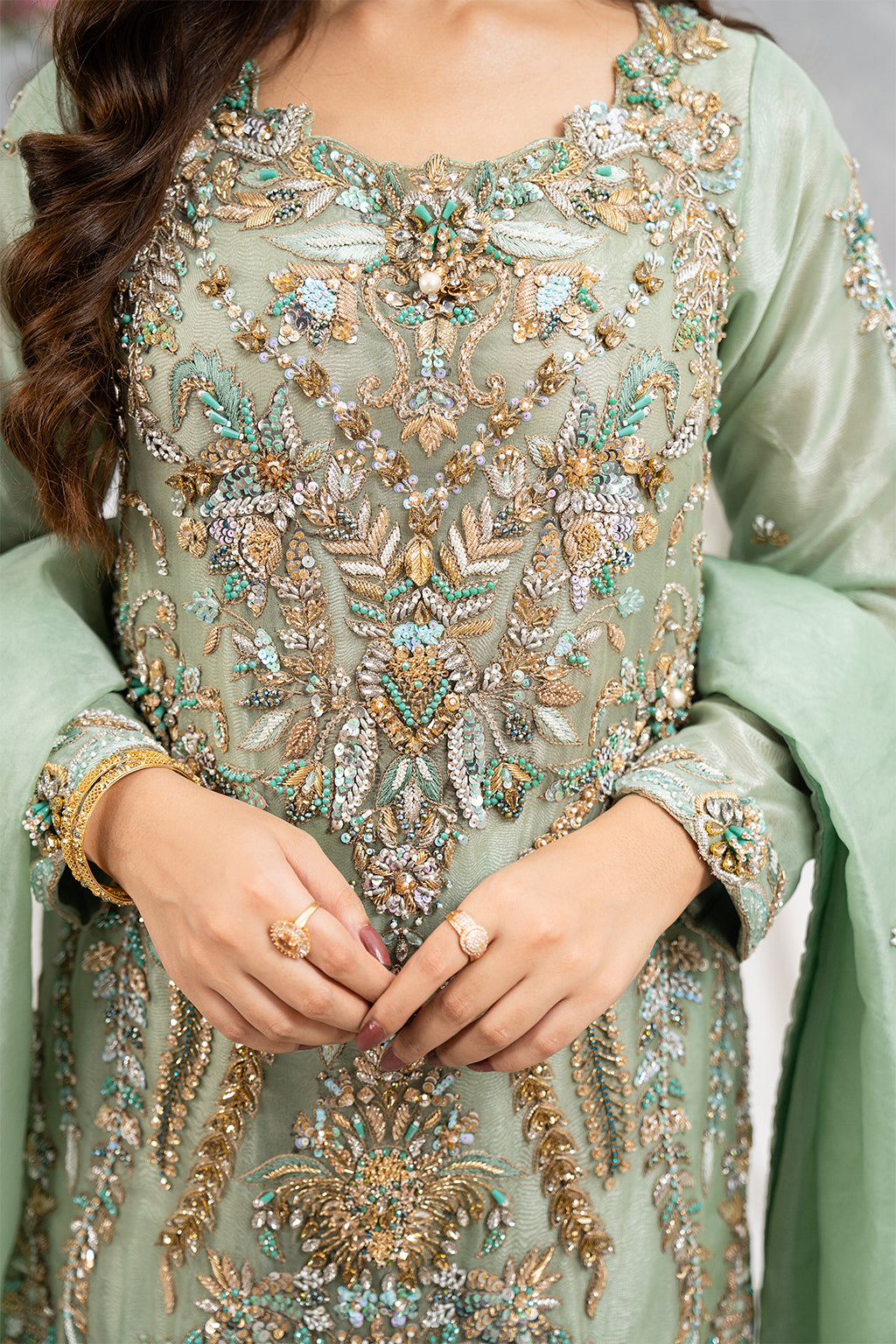 See green shirt with full heavy front work and back also with nice spray on duppta and have sharara with a work on ankel
