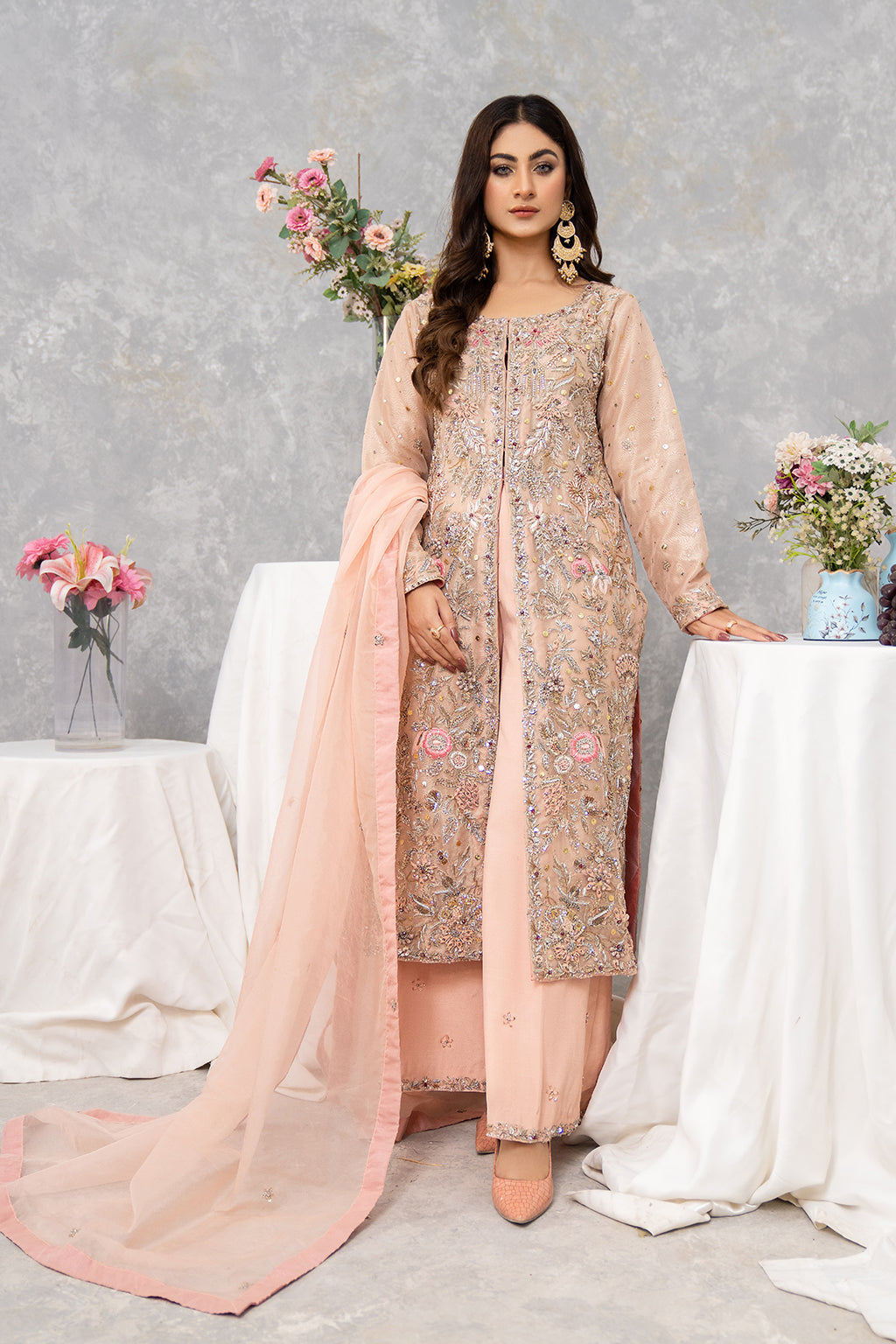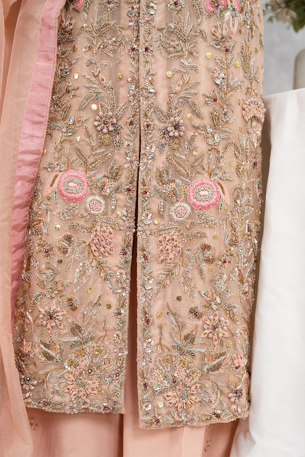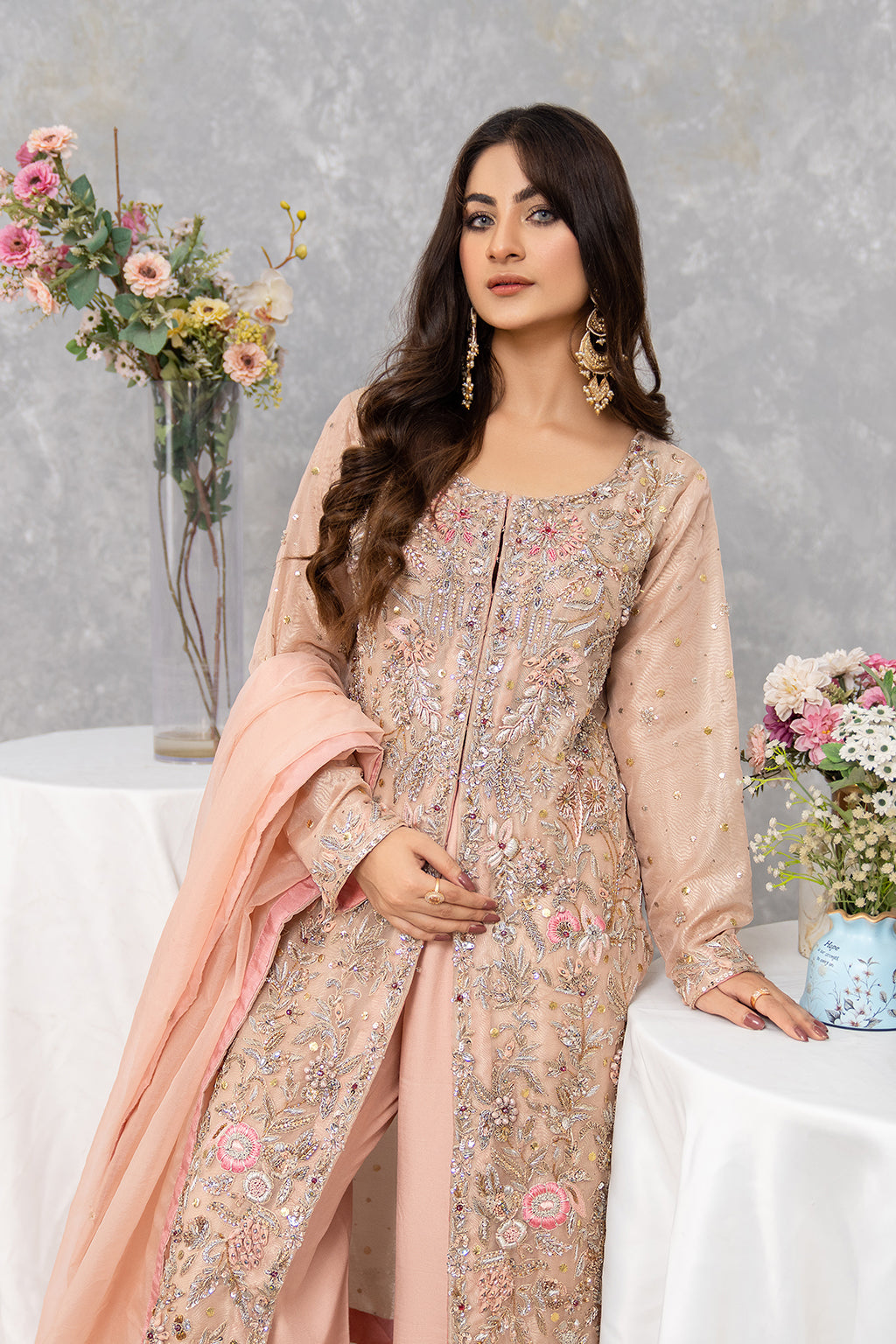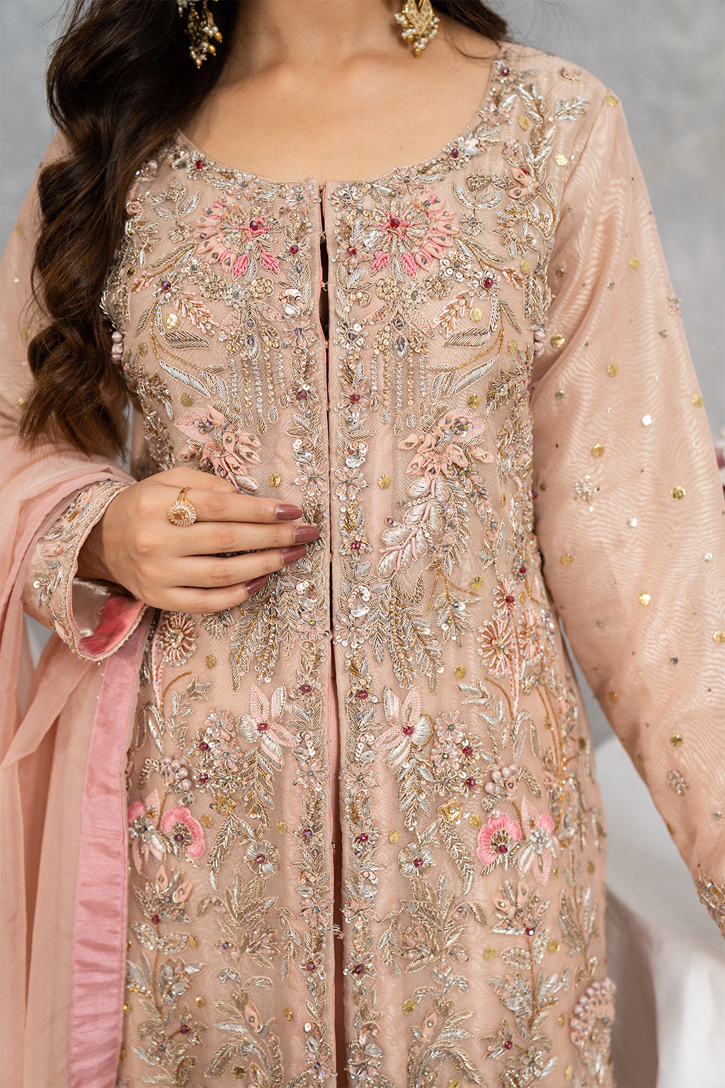 Pink gown have full heavy front work and back have also with nice spray on duppta and trouser