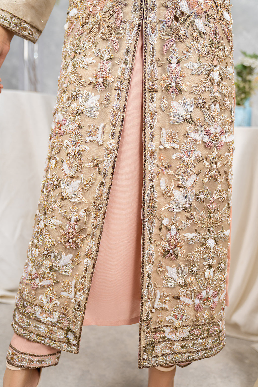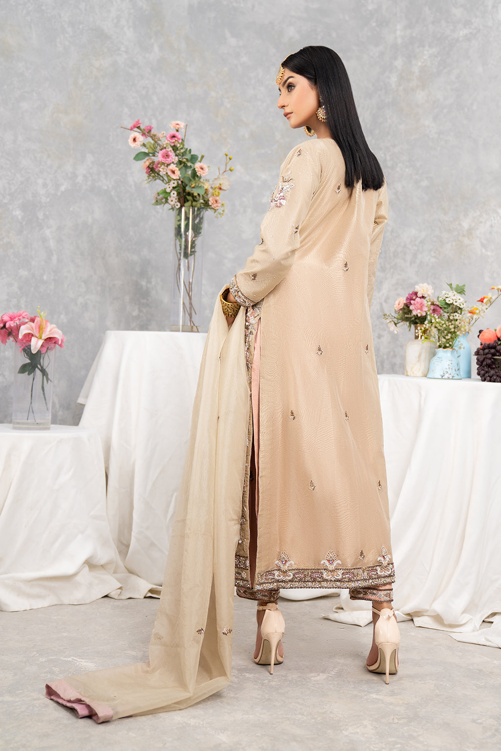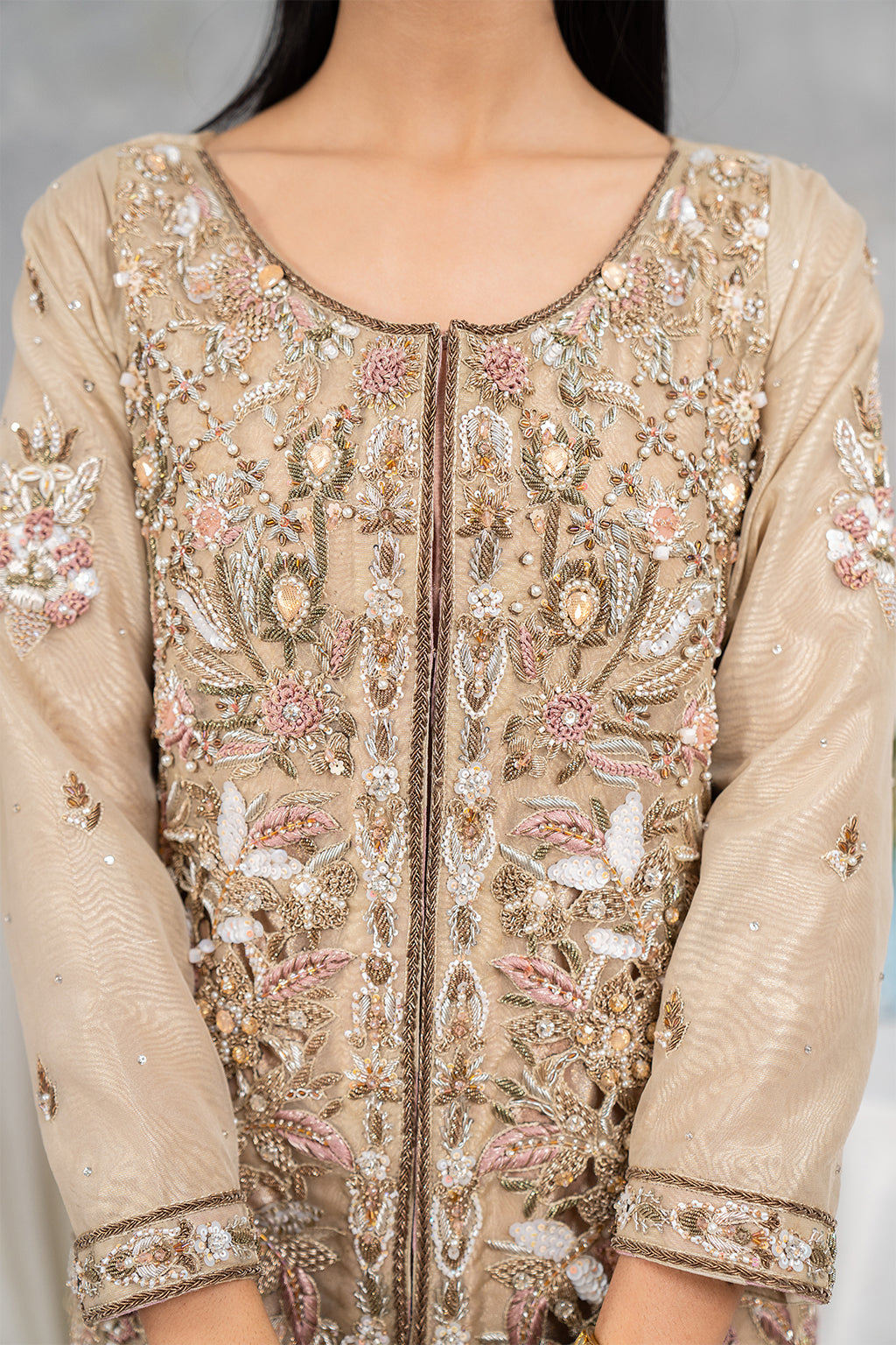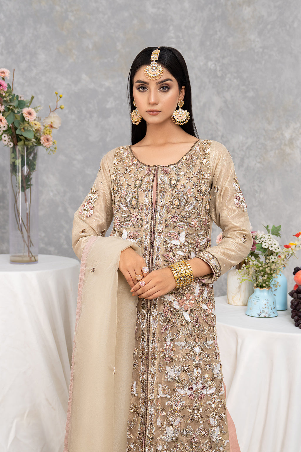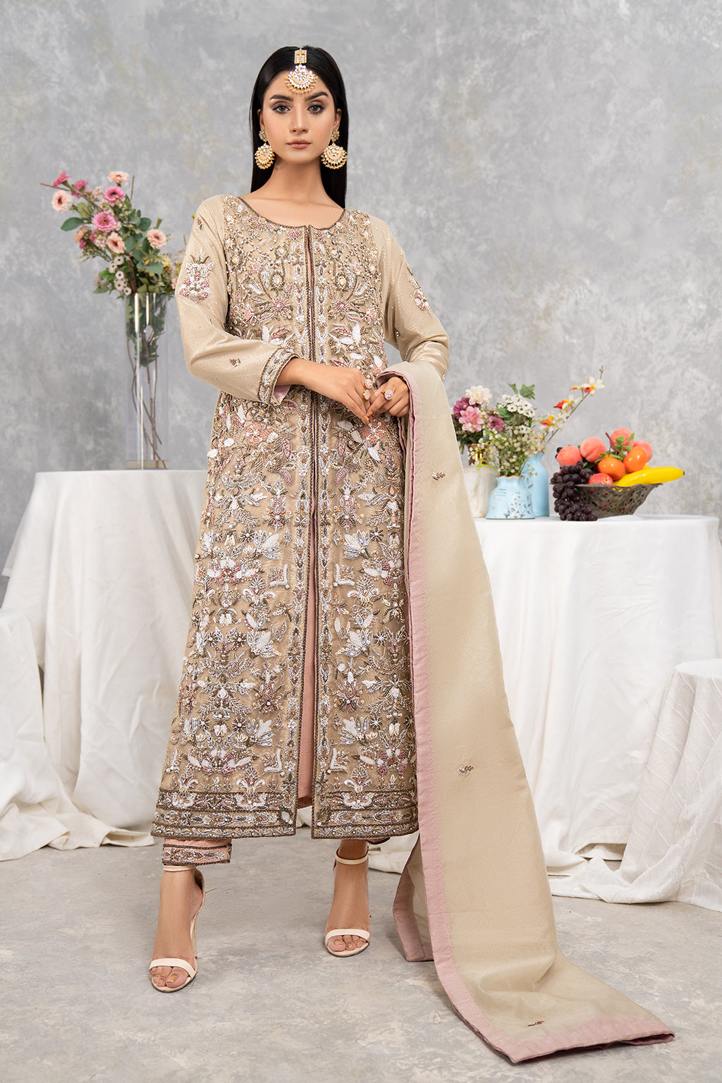 Grayish gown with full heavy front work with good spray on duppta and with nice trouser