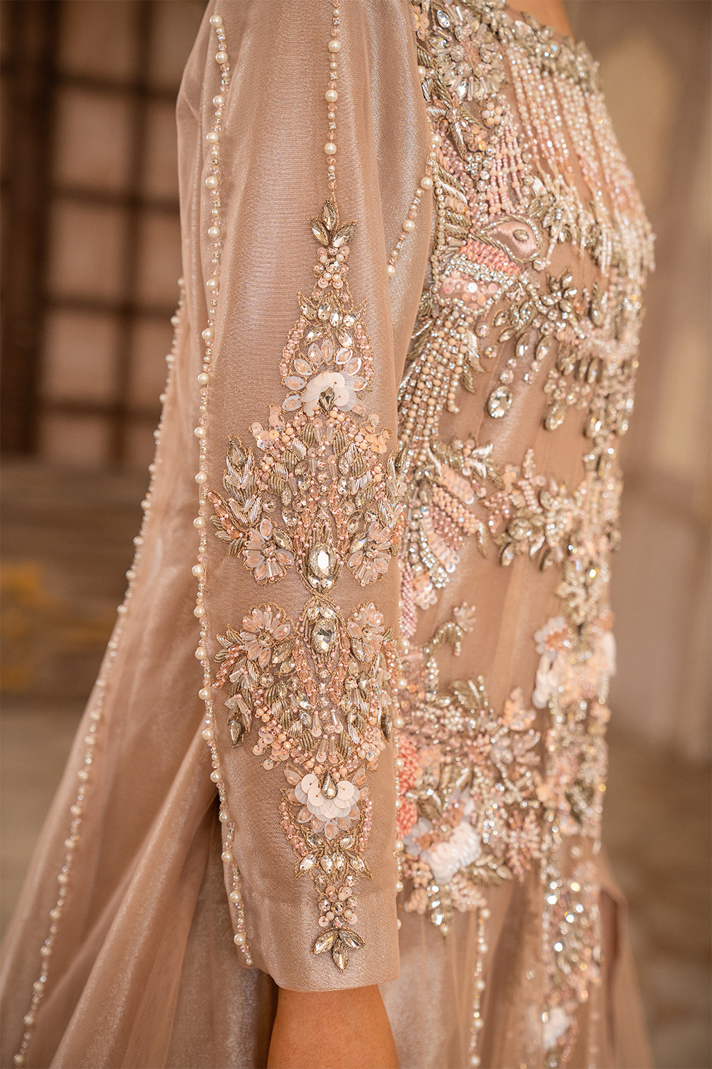 Golden organza maxi with delicate pearl, sequin, and crystal accents on the front bodice. Lightweight georgette dupatta features a subtle sequin scatter and narrow embellished border, perfect for evening wear.