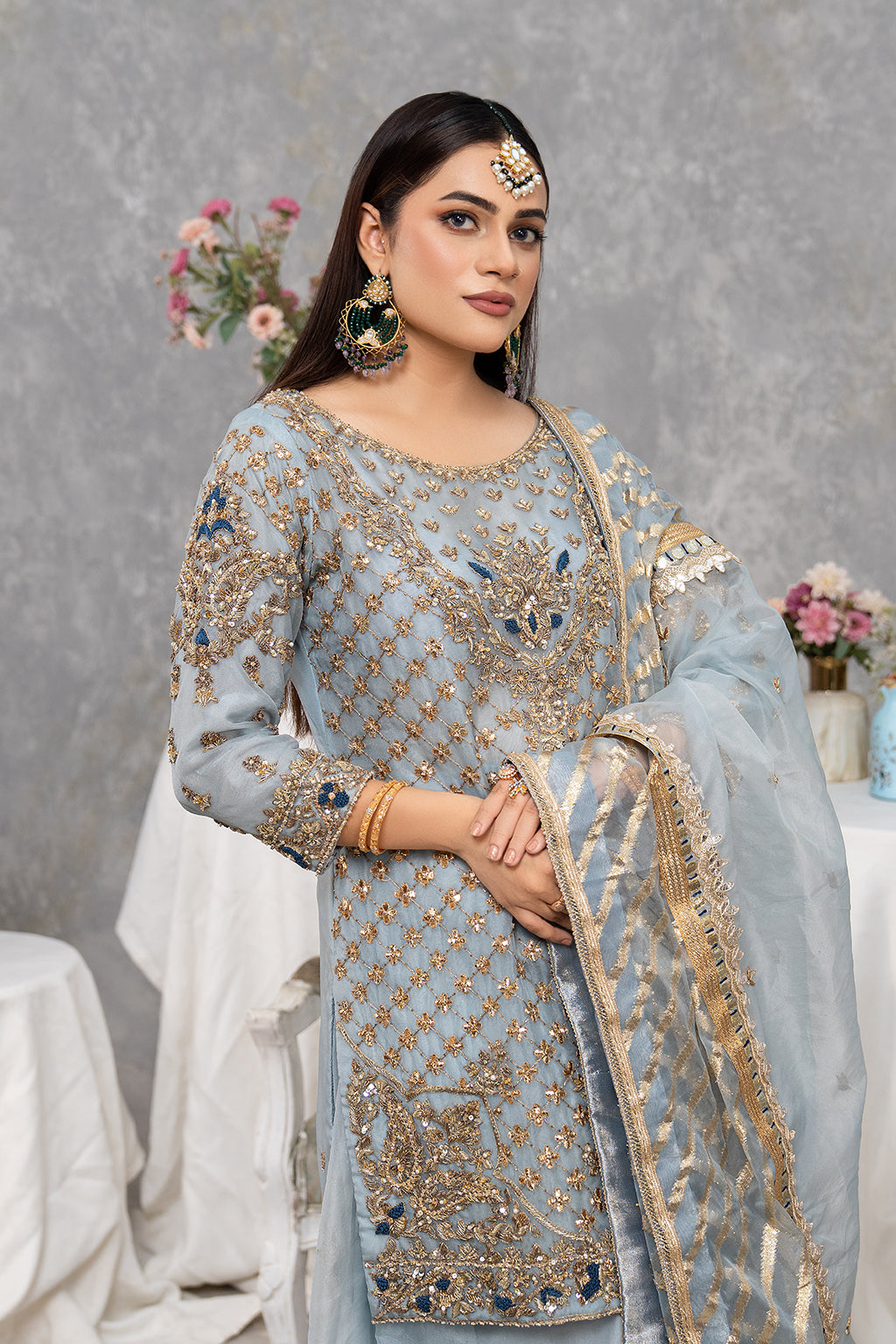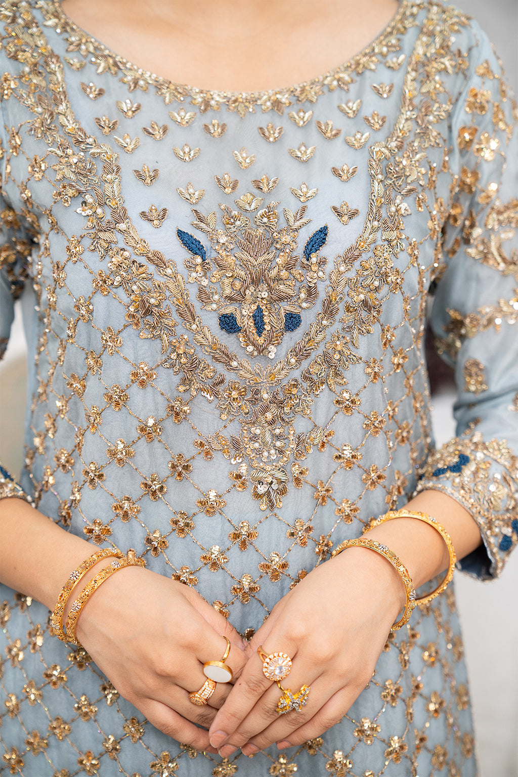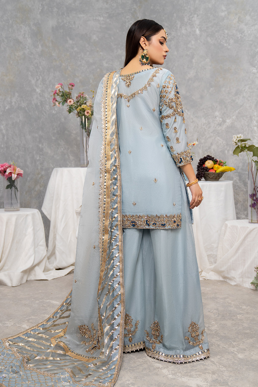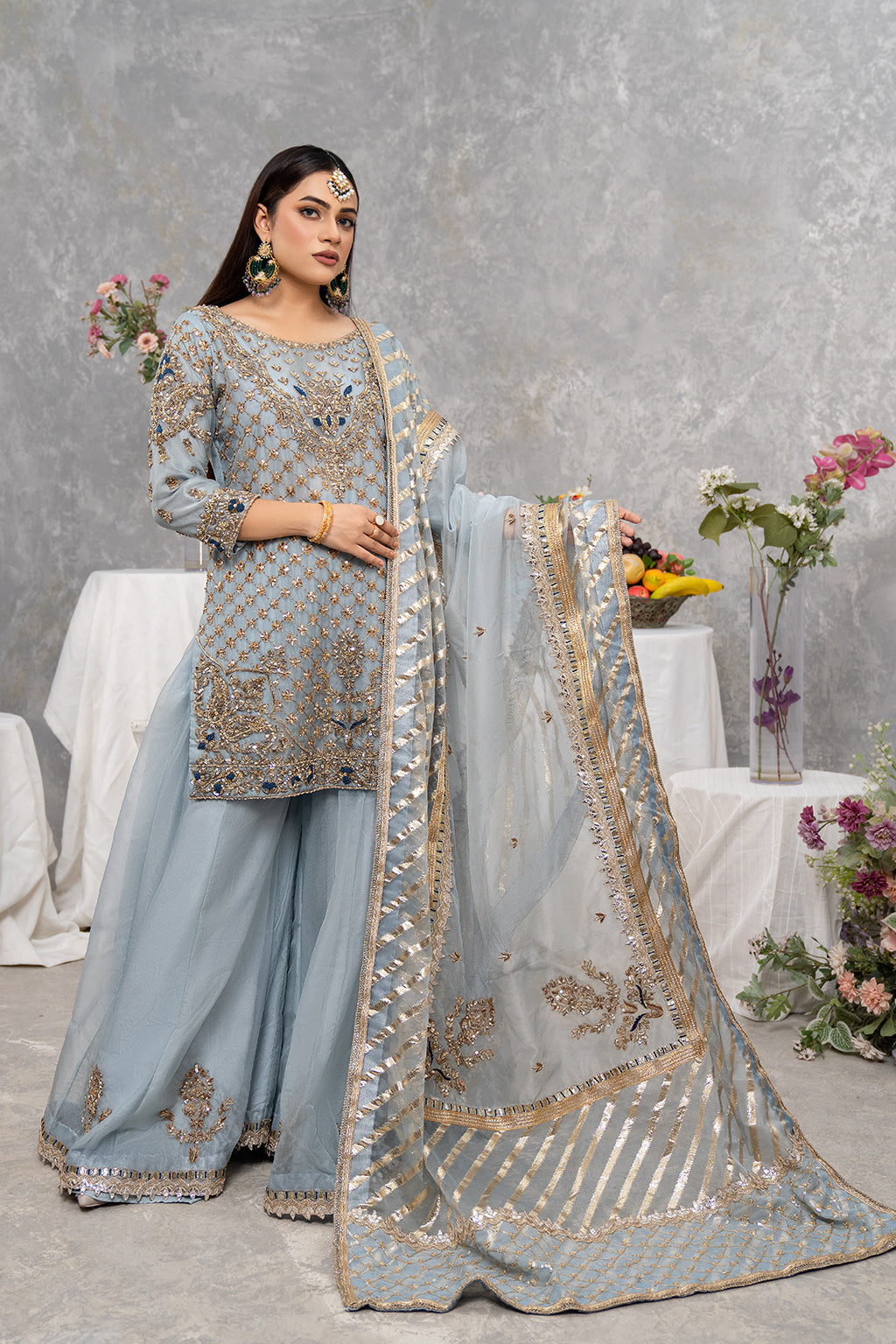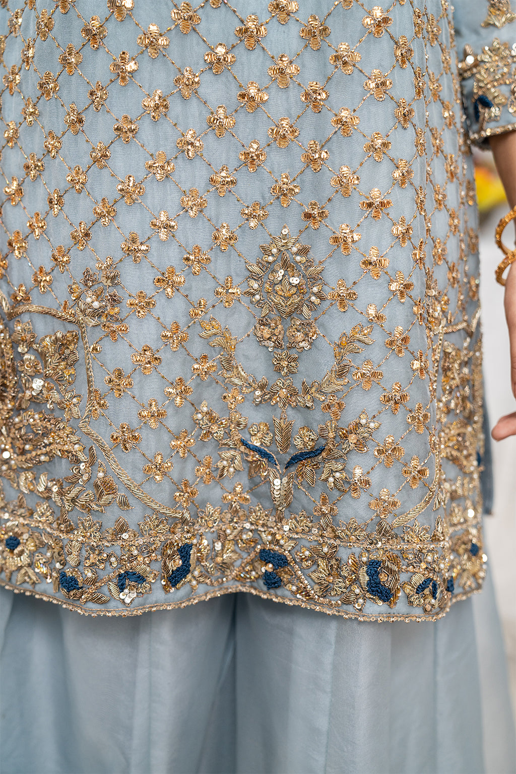 Sky blue shirt with full heavy work on front with heavy work on sleaves have very beautiful duppta with work on it with nice sharara