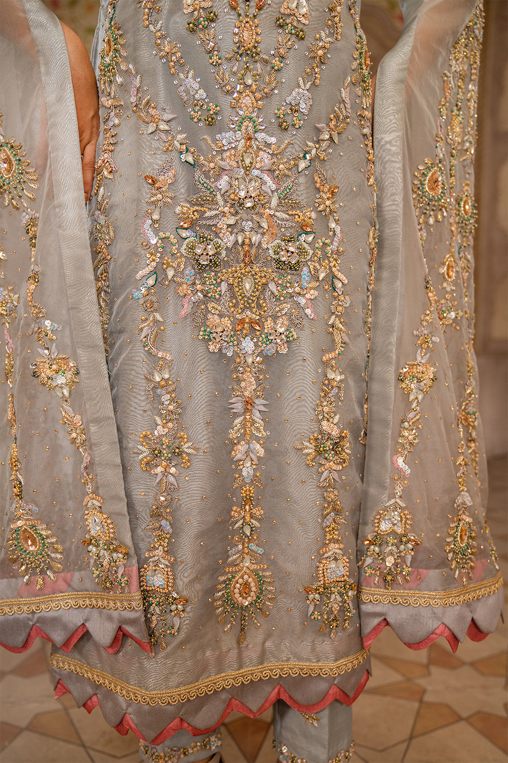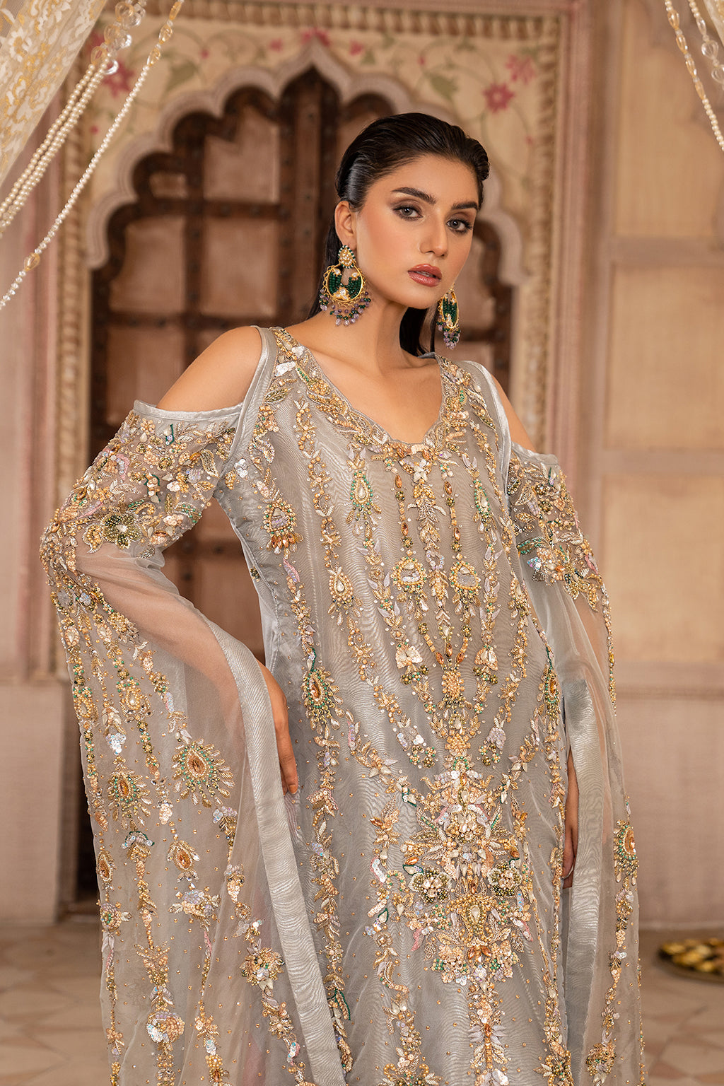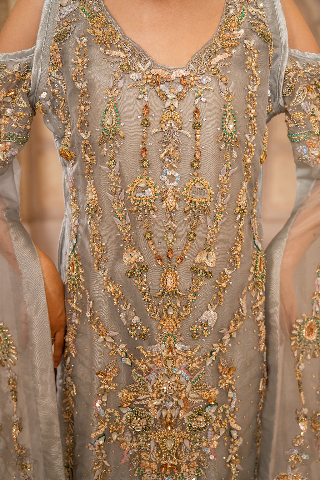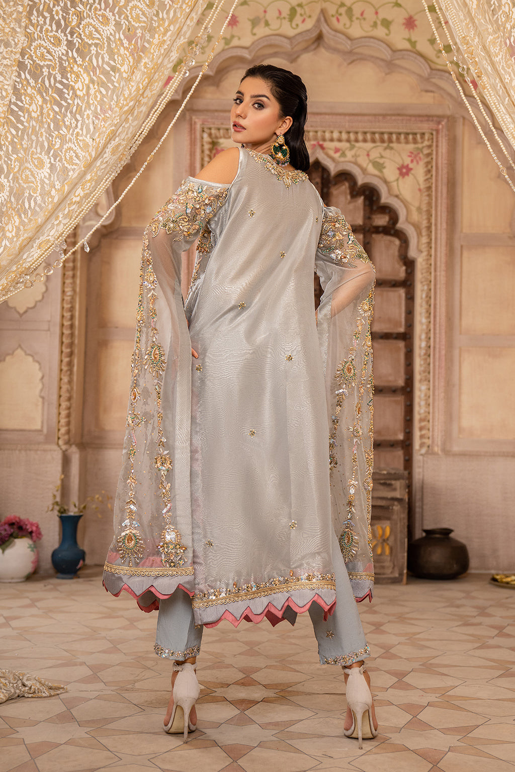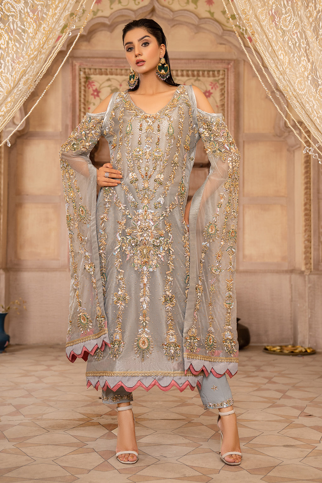 Gray shirt with very nice work on front and back also with very beautiful long sleaves have also heavy work with duppta and trouser